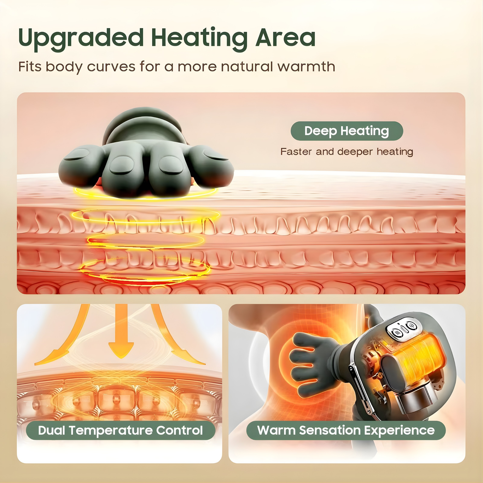 - 🔥 Activa la doble zona de calor para estimular la circulación y relajar los músculos.